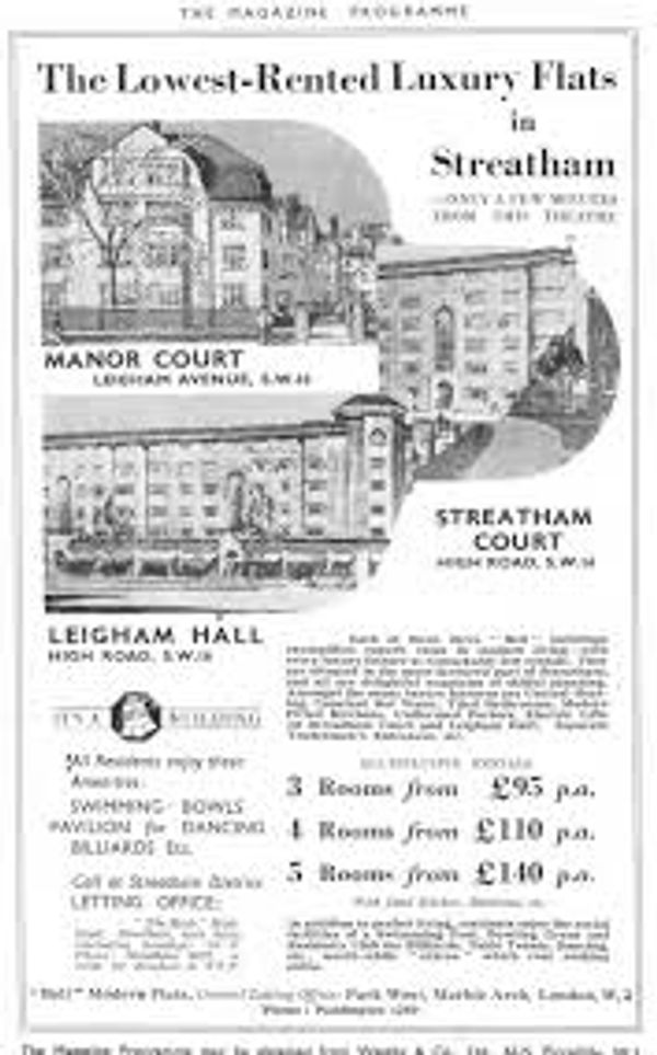 This attractive four storey development arranged around a large central garden was also a Bell scheme designed by Toms and Partners. Dating from circa 1935 these blocks of flats have white painted brick exterior walls and Dutch style mansard roofs. The mansard roofs incorporate dormer windows and the roof coverings are small clay tiles. Each block has a central return gable with a full height canted bay and paired windows on each floor. The original Crittall type windows are painted black throughout the complex. The entrance doors have a simple swept porch with a stylised Art Deco double height stair window above. The central garden is well stocked with mature shrubs and flowers and makes a quite retreat away from the busy commercial High Road. The original sales brochure boasts a residential club with amongst other attractions a pavilion for dancing. All-inclusive rents were advertised at £95 p.a. for three rooms and £110 p.a. for four rooms. This particular Bells development, along with Wavertree Court further up Streatham Hill, is comparable with Ealing Village, West London. Baling Village also in the 1930’s Dutch style, and designed by R. Toms and Partners for the Bell Property Trust was Listed Grade II in 1991.